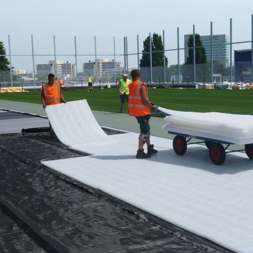 Über die Abdichtungsbahn wurde ein schützendes Geotextil abgerollt, anschließend wurden die 28 mm dicken nidasport-Platten in Kreuzfugen auf einen Abfluss gelegt. Vor der Aufnahme des Kunstrasens wurde eine 12 mm dicke Stoßpolsterrolle auf die Platten gelegt. Letztere wurde mit Sand 0,8 / 0,6 mm (21 kg / m2) und 6 kg / m2 SBR / TPE beschwert.