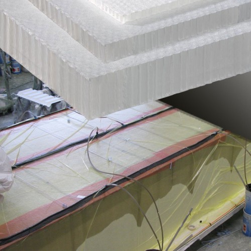 Nidaplast Platten aus extrudierten Polypropylen-Waben sind beidseitig mit einer Kunststofffolie und einem Vlies beschichtet, was Laminier-, Klebe- oder Infusionstechniken ermöglicht.